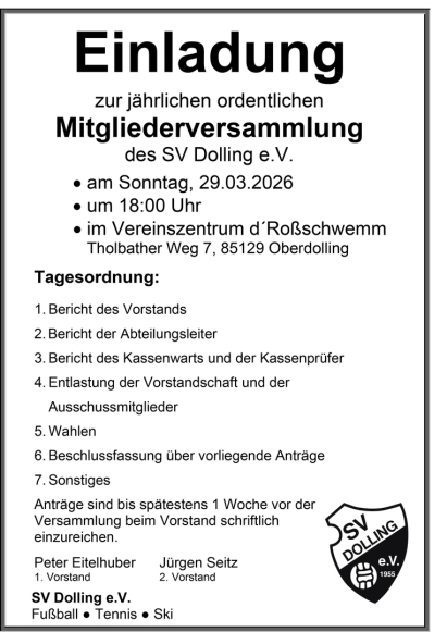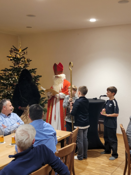 Auch dieses Jahr lud der SV Dolling wieder zur Weihnachtsfeier in die Rossschwemm ein. Nach der Begrüßung durch unseren Vorstand wurden die Gäste mit gutem Essen verwöhnt. Danach wurde der gemütliche Teil eingeläutet und wieder geschätzt. Diesmal war das Gewicht von einem großen Paket voll mit Bauernwürsten zu erraten. Anna und Hanna trugen ein Gedicht vor und dann besuchte uns der Nikolaus mit seinem Krampus. Er berichtete Interessantes und Lustiges von den Fußballern und Tennislern, und so manch einer bekam die strenge Rute vom Krampus zu spüren! Danach führte Markus (genannt V), erstmalig durch ein Weihnachts-Bingo, was allen Anwesenden sichtlich Spaß bereitete. Die Gaudi ging weiter mit der Versteigerung von Weihnachtskalendern der anderen Art „SV Dolling 2026 unzensiert“, welche ein reges Bietergefecht auslösten. Eines der beiden begehrten Exemplare bekam eine Mama noch vor Ort als Weihnachtsgeschenk überreicht. Als krönenden Abschluss gab es wieder eine Tombola mit vielen tollen Preisen. Herzlichen Dank an alle Helfer und Sponsoren, die zum Gelingen der Weihnachtsfeier beigetragen haben, und natürlich auch an alle die zur Weihnachtsfeier gekommen sind. Schön und lustig wars!