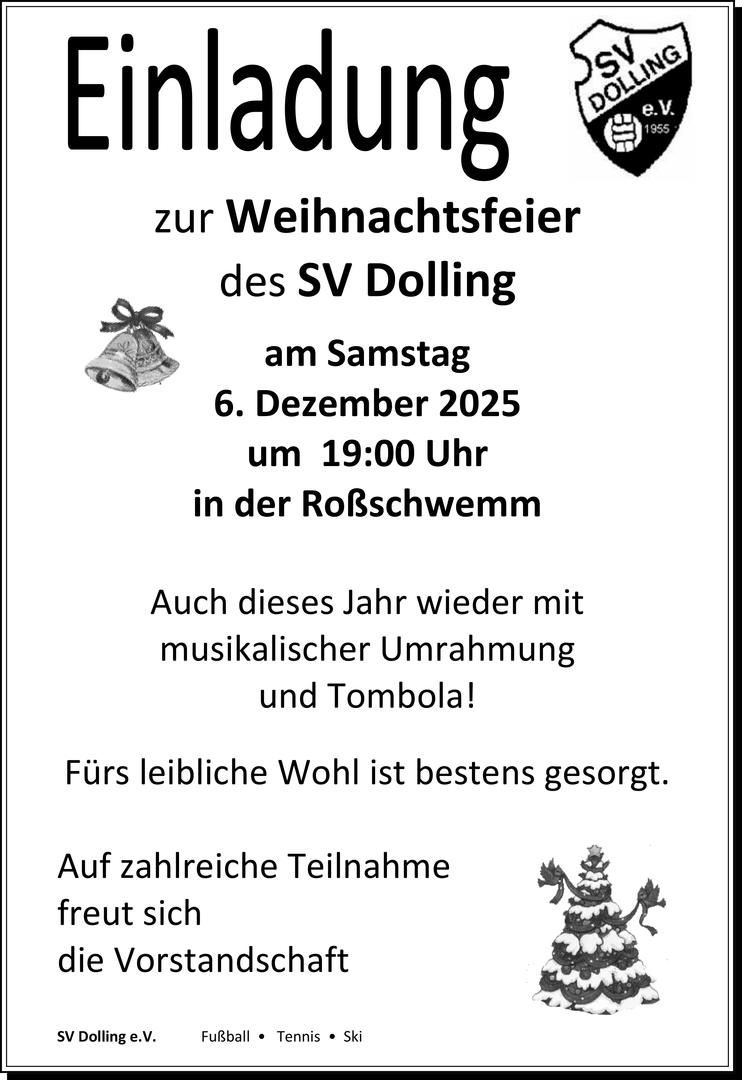 Der SV Dolling e.V. stellt Ihnen viele unterschiedliche Sport- und Spiel-Angebote zur Verfügung. Dies sind zum Beispiel: Fußball und Ski ebenso wie Tennis und Badminton - um nur einige zu nennen. Spaß an Spiel und Bewegung ist hier garantiert!